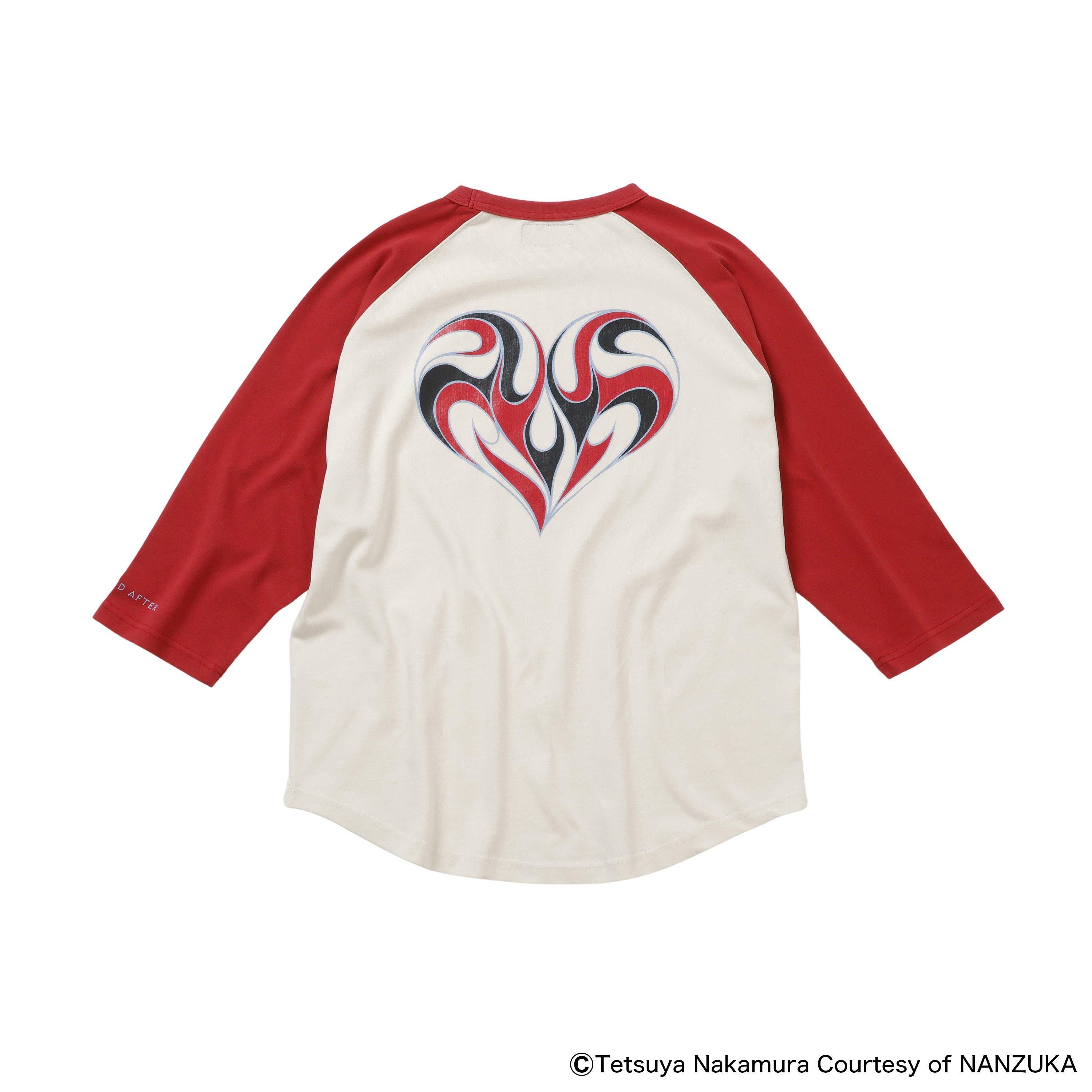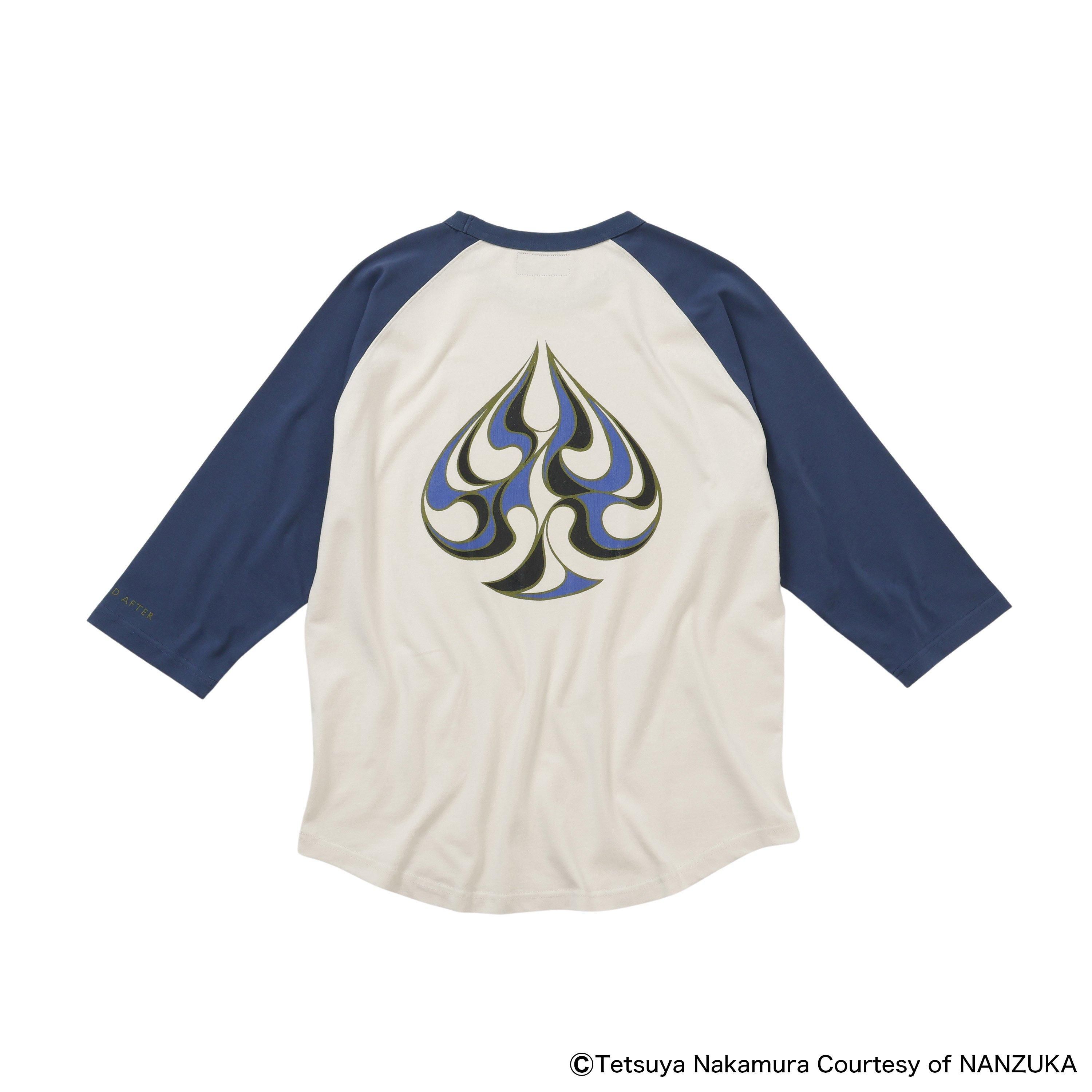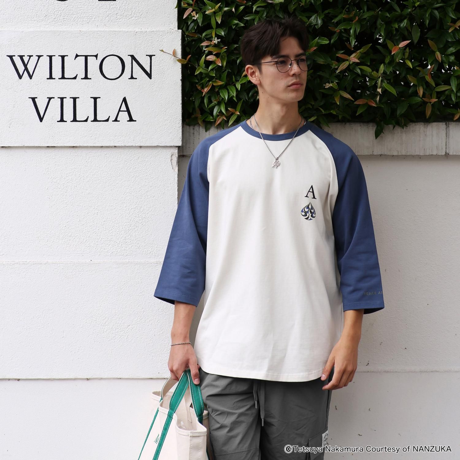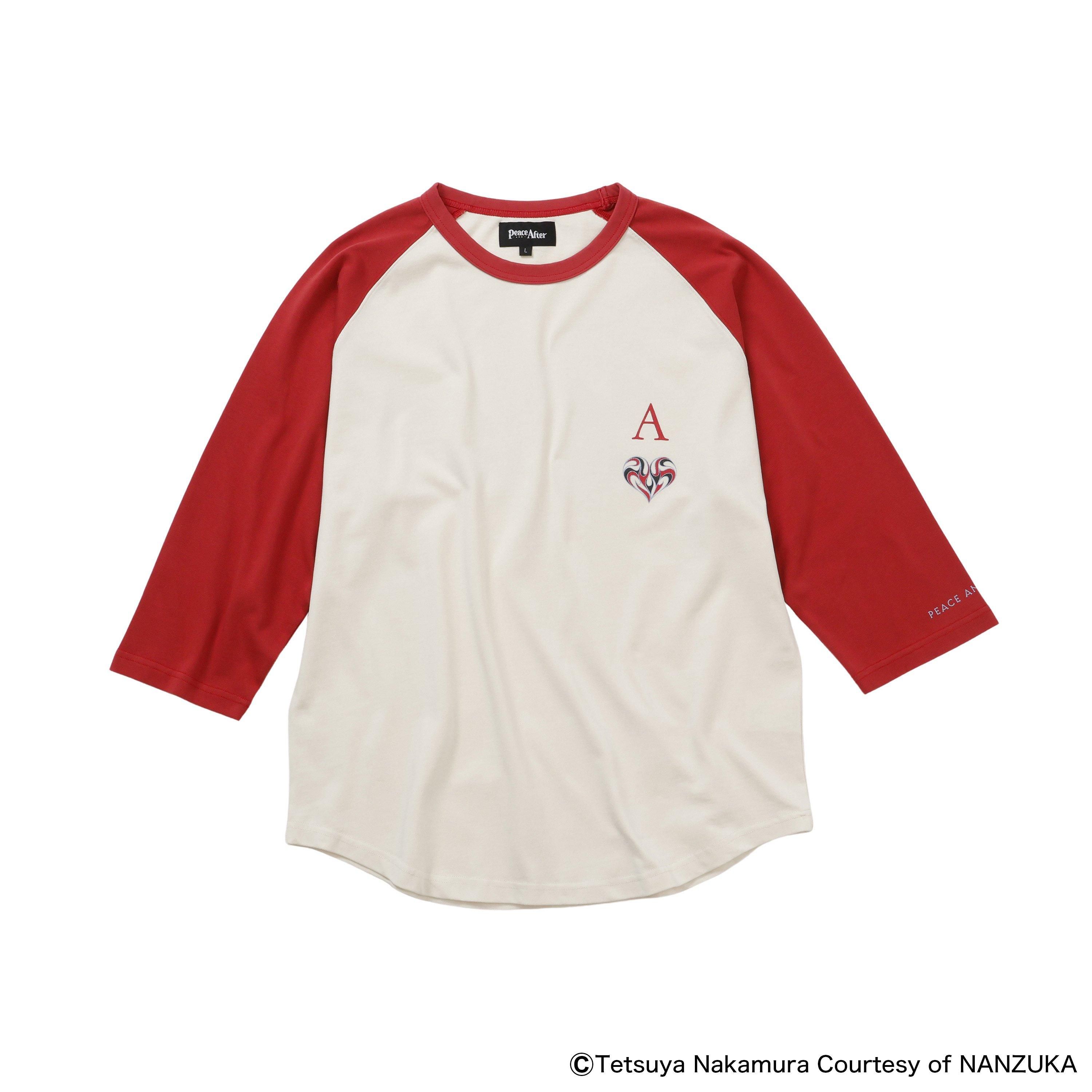 This is the first collaboration collection with Tetsuya Nakamura, an artist who has received significant acclaim in the contemporary art world. It features an original raglan sleeve T-shirt made from 9.1 oz. thick cotton jersey material. The design includes motifs inspired by playing card patterns, expressed through crack print on the left chest and back. The sleeves are 3/4 length, with contrasting colors for the collar and sleeves compared to the body, and a rounded hem.