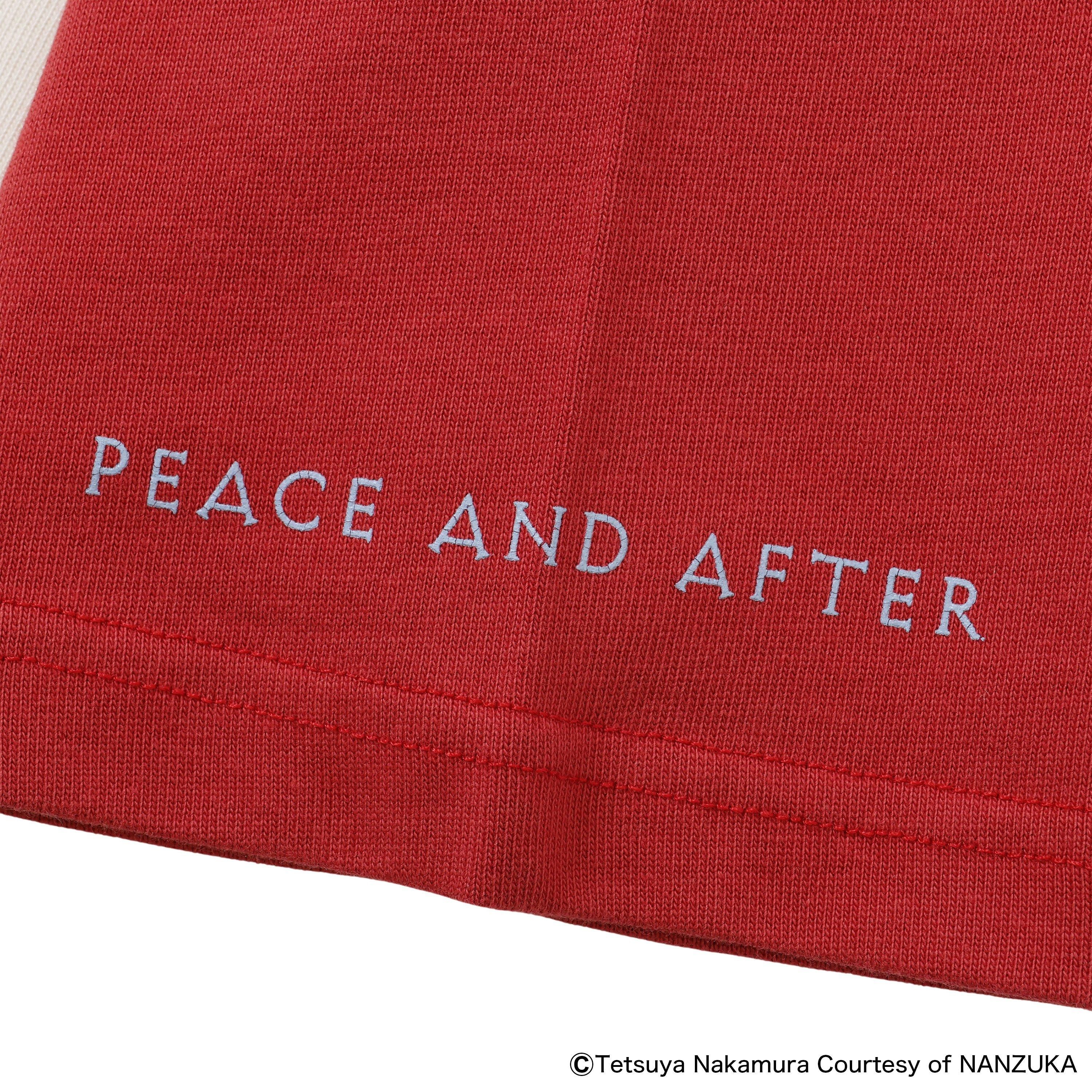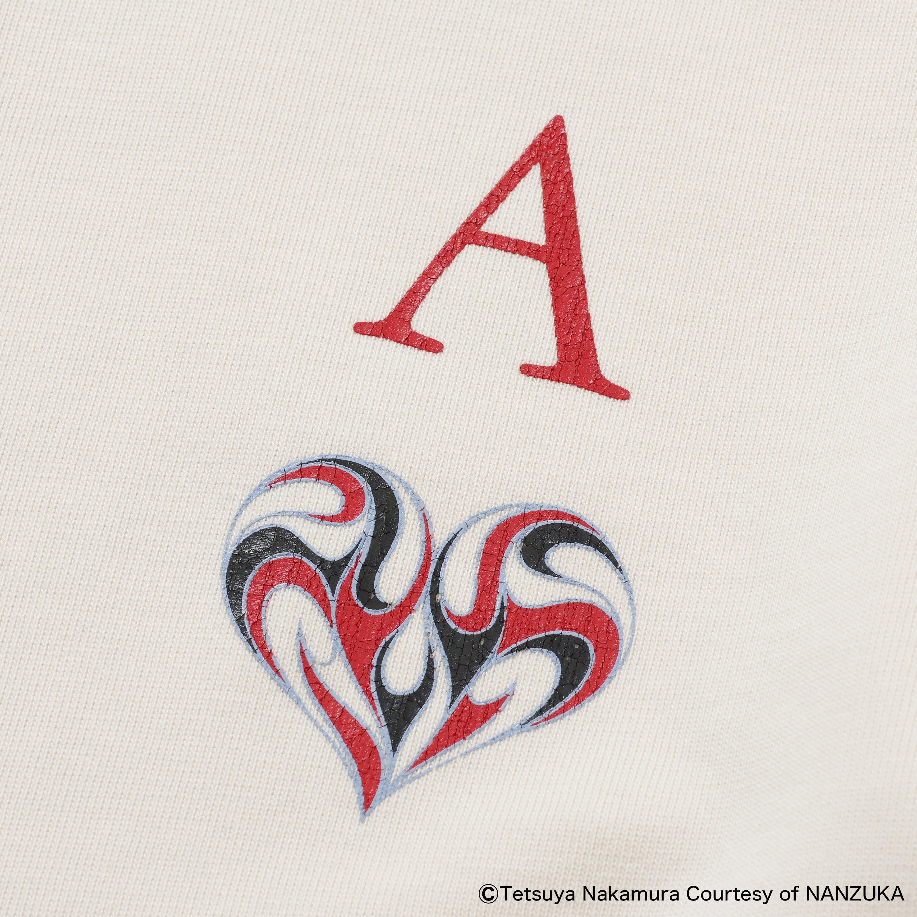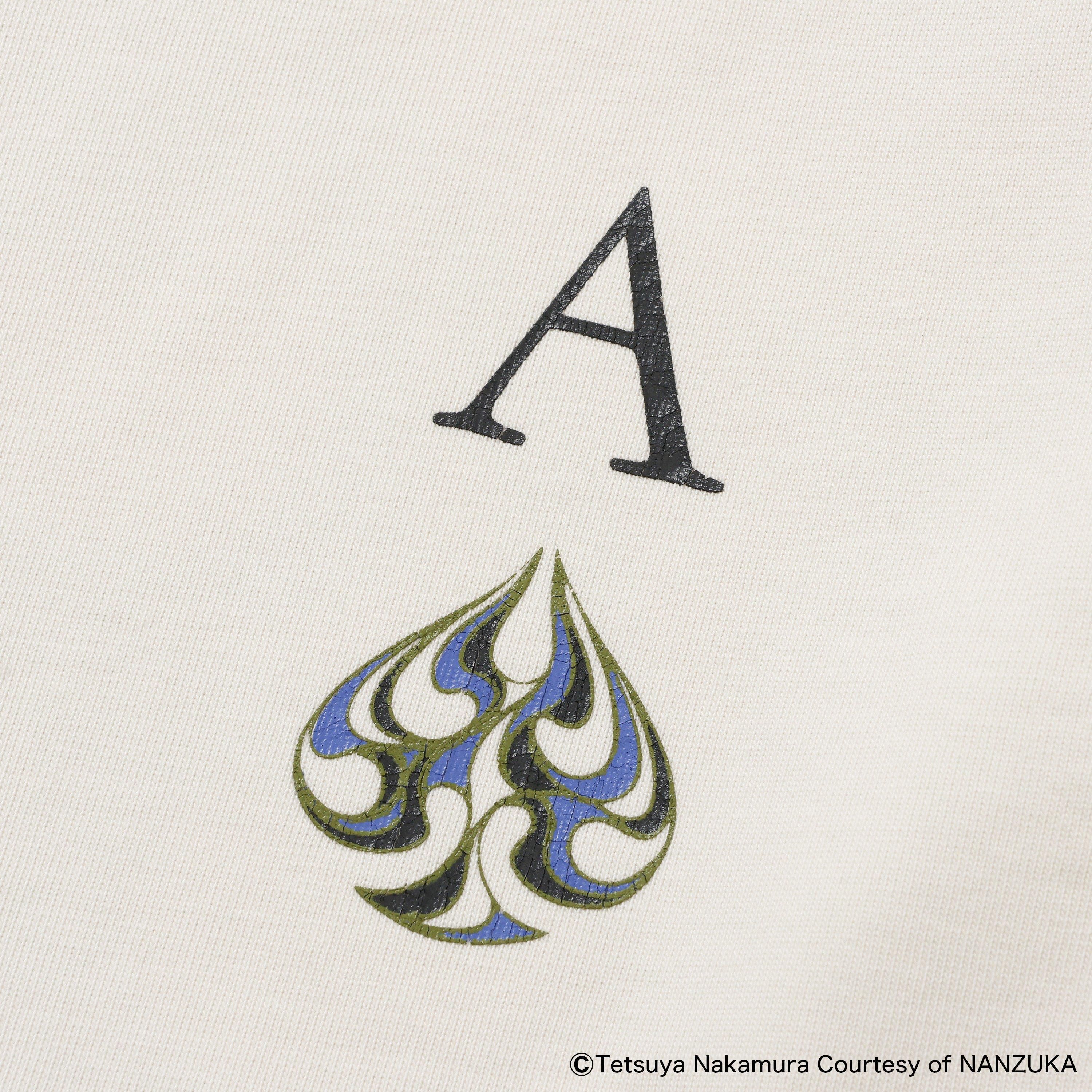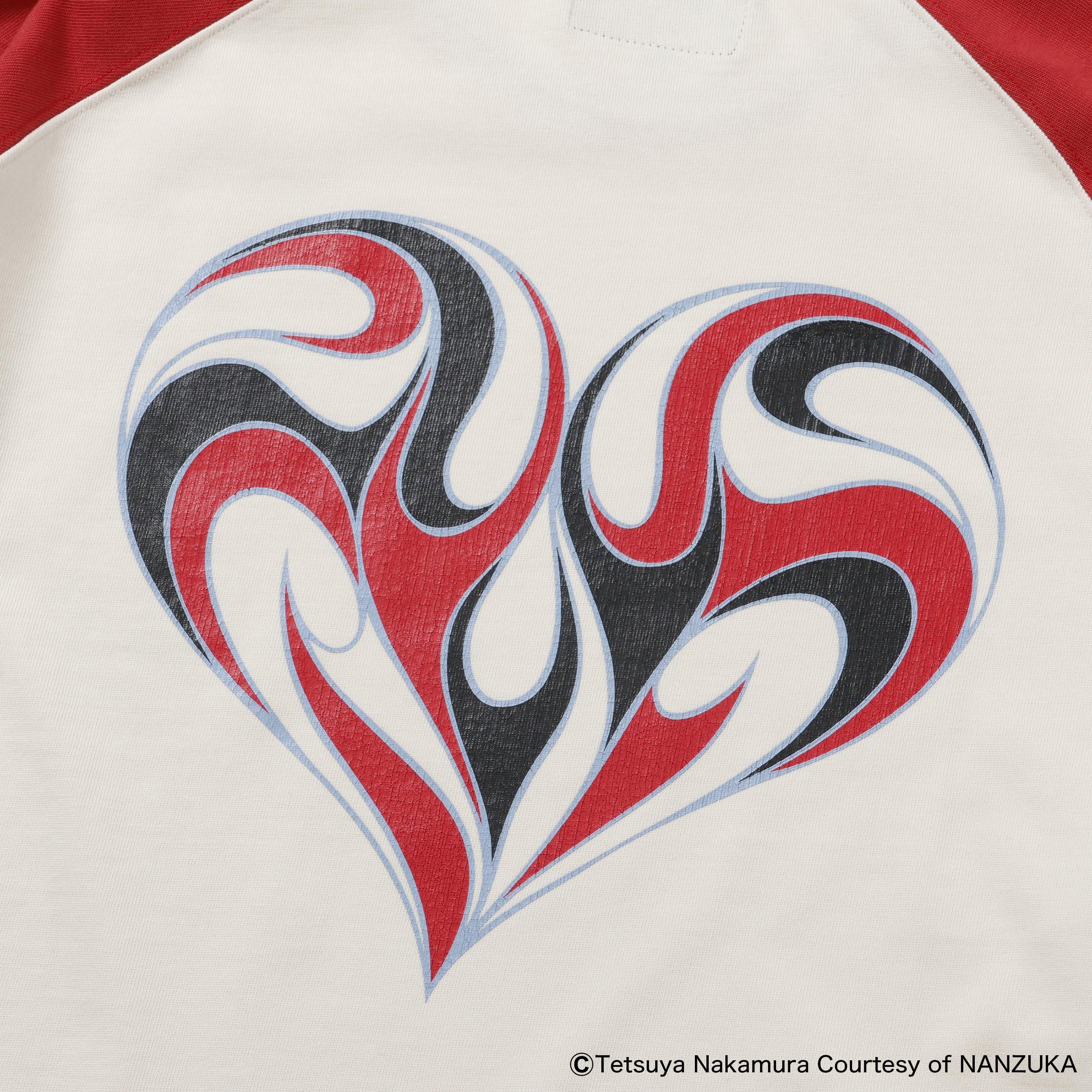 This is the first collaboration collection with Tetsuya Nakamura, an artist who has received significant acclaim in the contemporary art world. It features an original raglan sleeve T-shirt made from 9.1 oz. thick cotton jersey material. The design includes motifs inspired by playing card patterns, expressed through crack print on the left chest and back. The sleeves are 3/4 length, with contrasting colors for the collar and sleeves compared to the body, and a rounded hem.