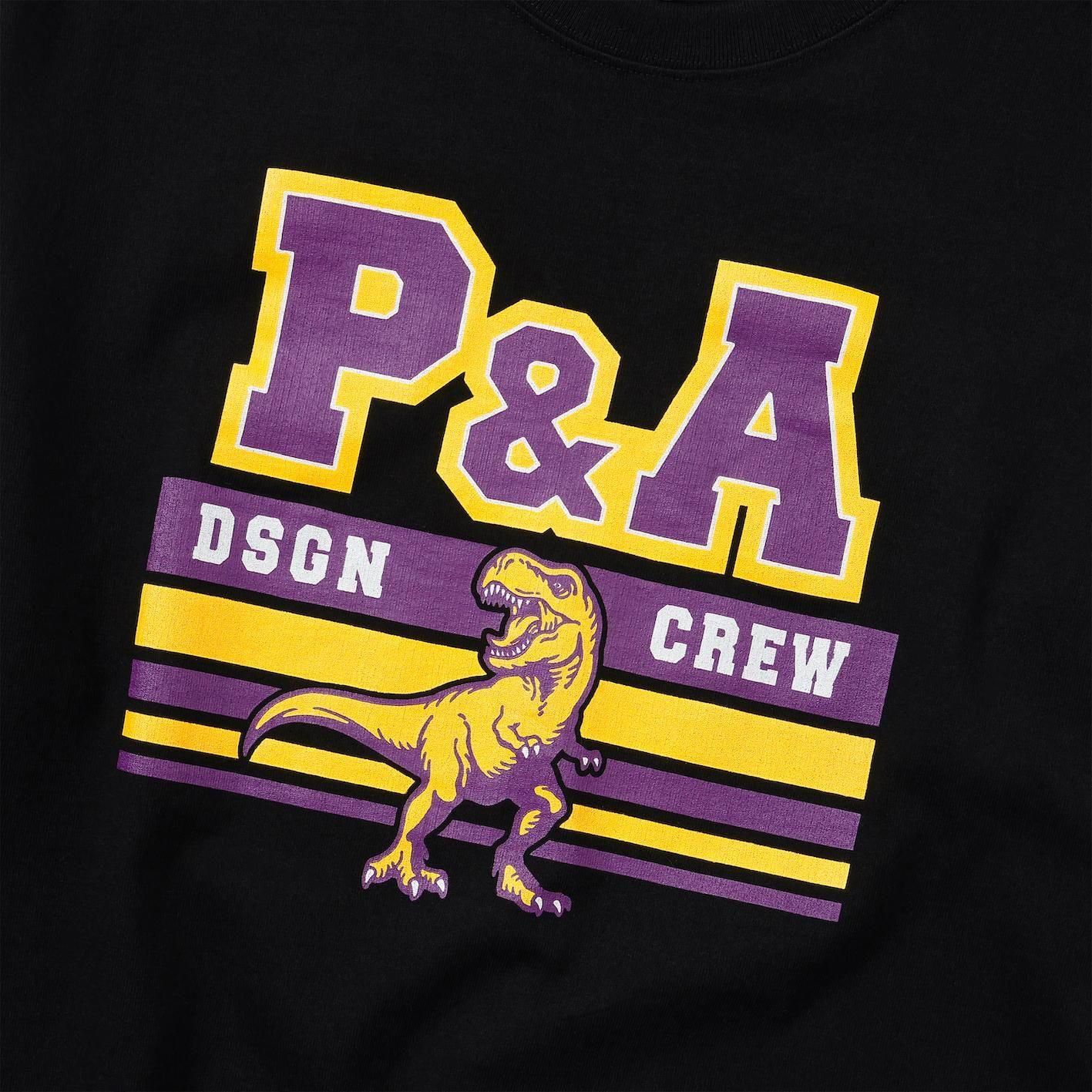This eye-catching T-shirt features the “P&A” logo from Peace and After, the DSGN CREW logo, and a college-inspired graphic of a T-Rex (Tyrannosaurus Rex).