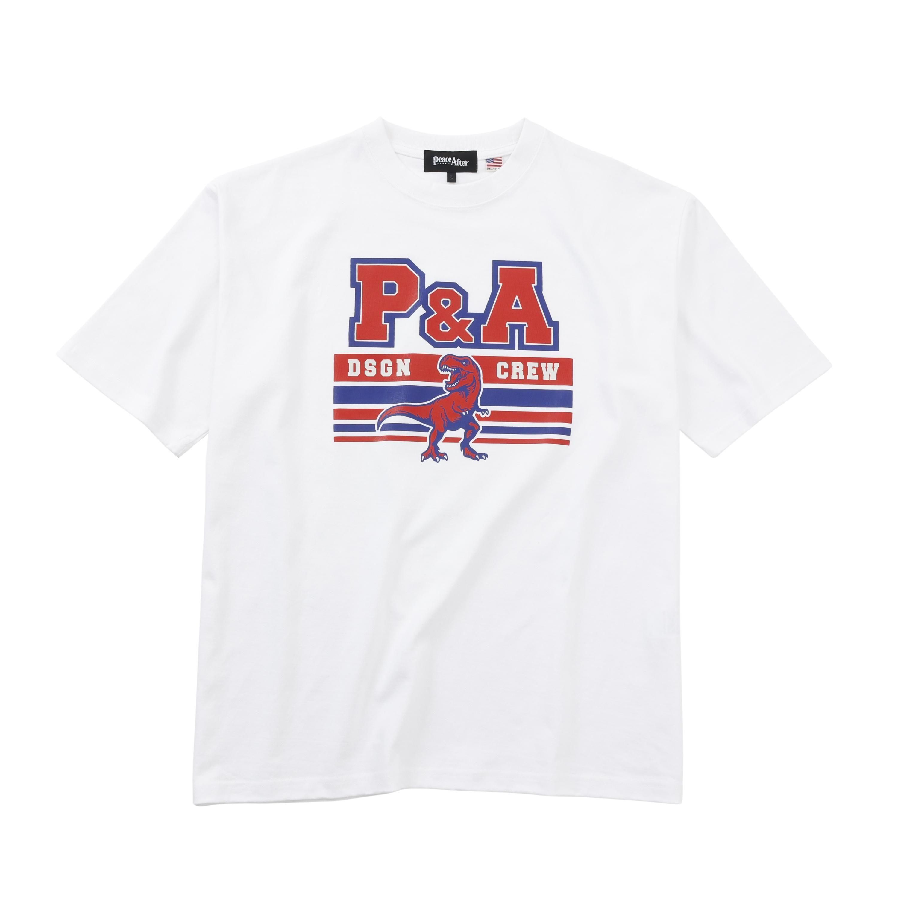"Peace and Afterの「P&A」と「DSGN Peace and Afterの「P&A」と「DSGN CREW(デザインクルー)」のロゴ、カレッジテイストのT-Rex(ティラノサウルスレックス)のグラフィックが目をひくTシャツ。