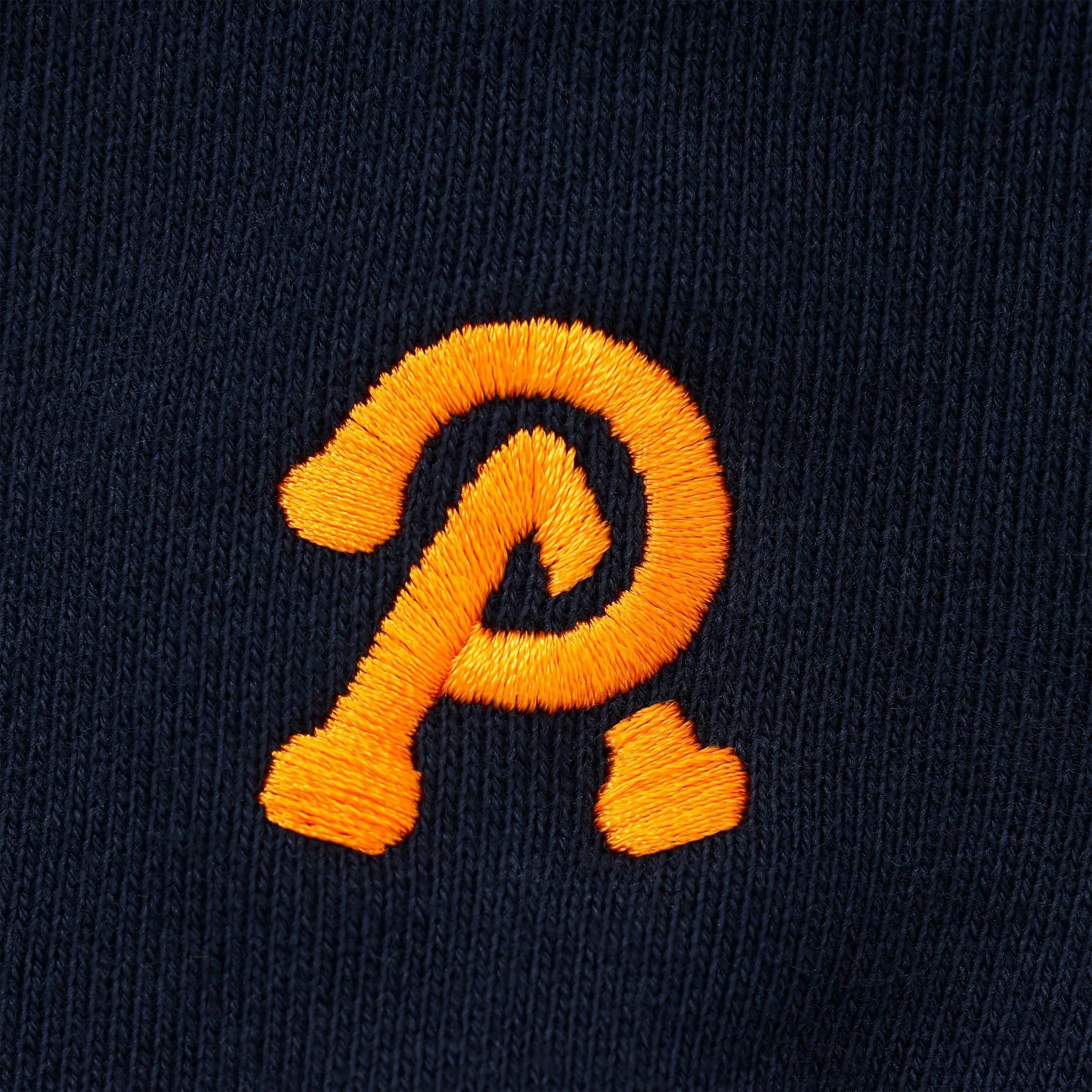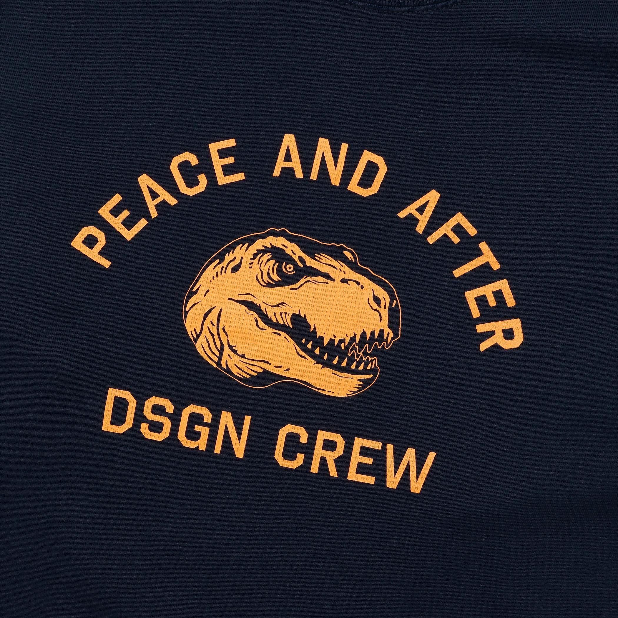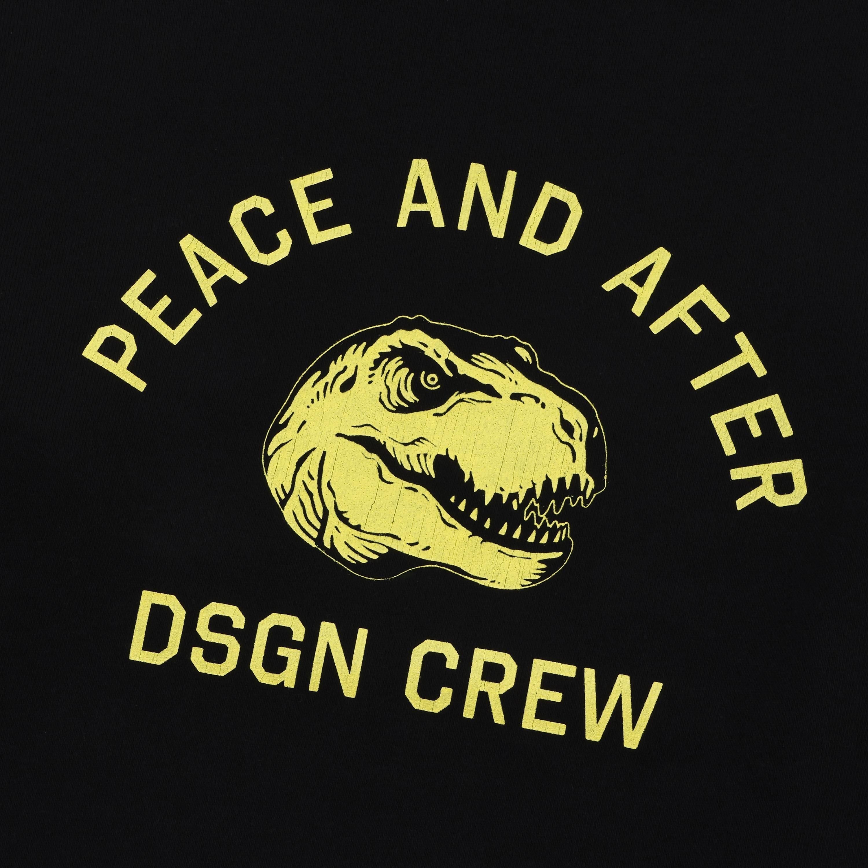 The front showcases a bold cracked rubber print artwork combining an arched P&A logo, a T-Rex face, and lettering graphics. An embroidered P-mark logo adds a subtle accent to the left sleeve. While featuring classic set-in sleeves, the relaxed body width offers a modern, roomy silhouette. The distinctive cracked print adds vintage character and visual edge.